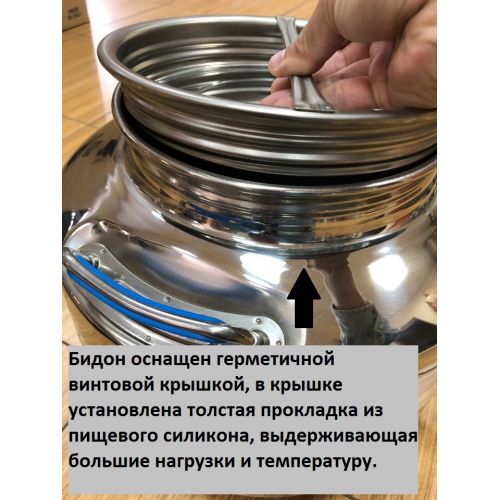 -Винтовая крышка с уплотнителем - основная крышка закручивается очень герметично, имеет прокладку из пищевого силикона, при наклоне жидкость не вытекает, при использовании емкости в качестве перегонного куба не сифонит.